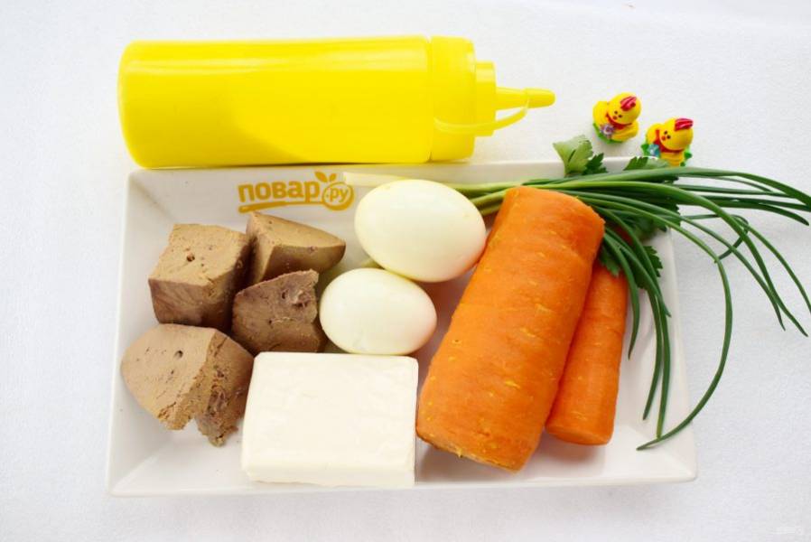 Подготовьте необходимые продукты. Заранее отварите печень, морковь и яйца. Яйца и морковь очистите, зелень вымойте.