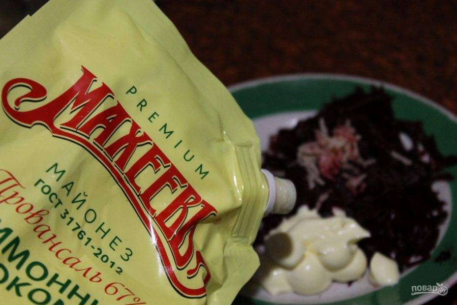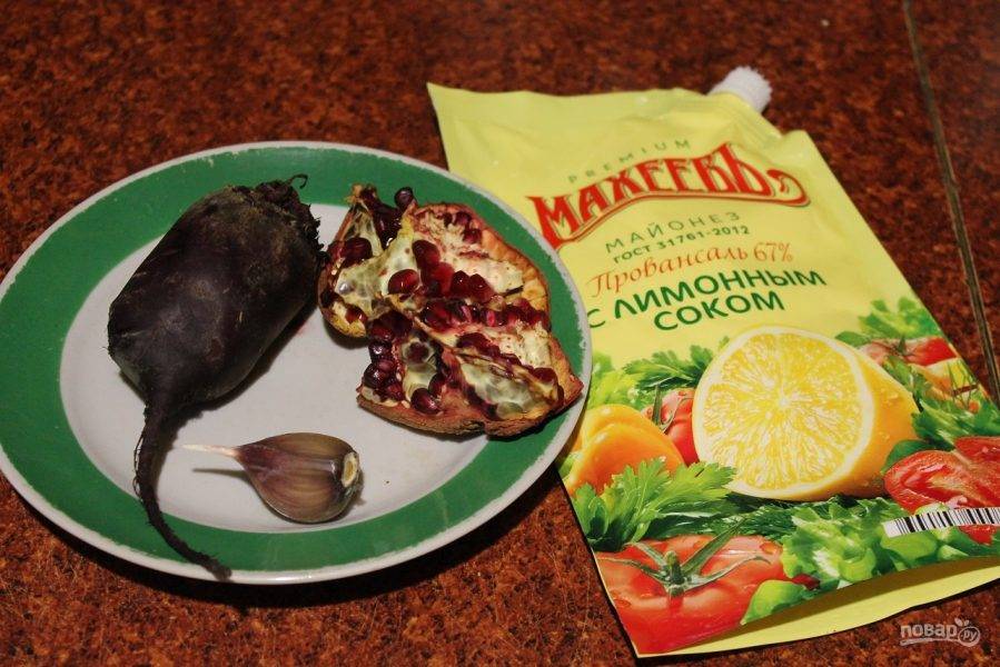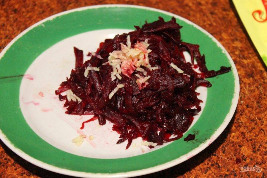 Свеклу натереть на крупной терке. Чеснок почистить и измельчить.