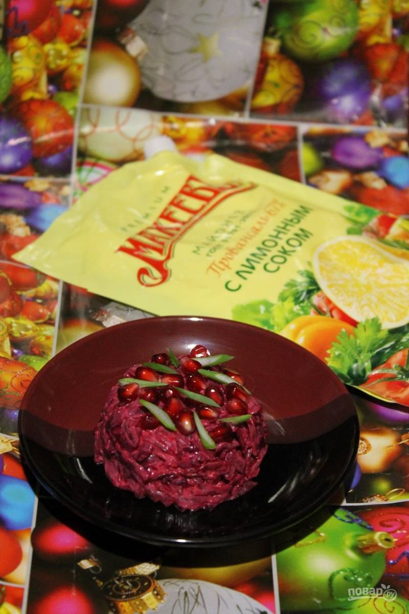Выложить салат на блюдо. Украсить зернами граната и зеленью.