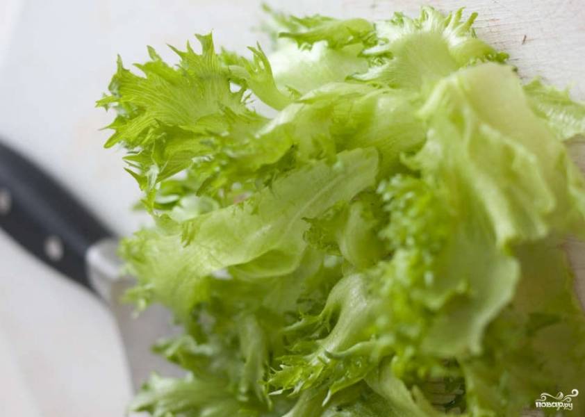 Листья салат крупно нарезать или порвать руками. Поверх выложить лук (можно слегка отжать).