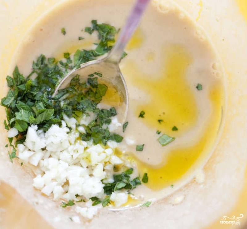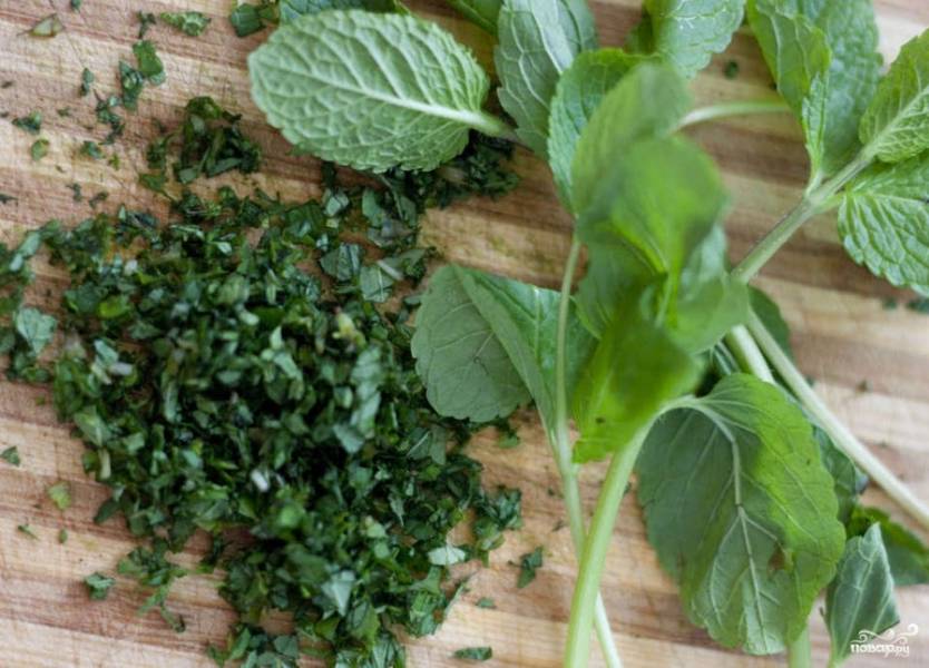 Уксус, который остался от маринования лука, смешать с горчицей, солью, перцем и маслом. Добавить чеснок и мяту, перемешать.