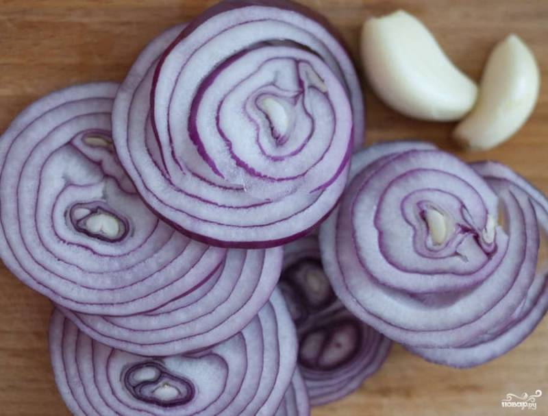 Лук почистить и нарезать тонкими кольцами. залить уксусом и оставить минут на 5-10.