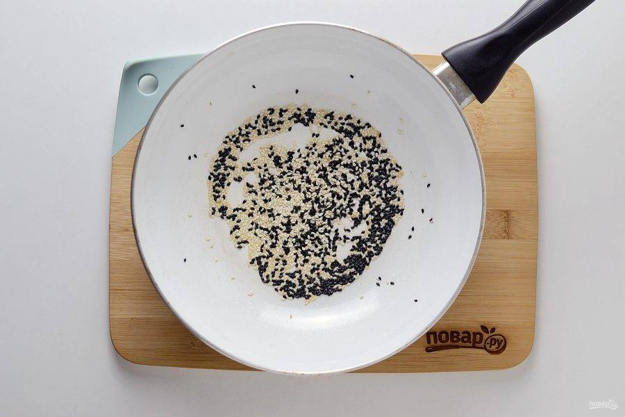 Кунжут обжарьте до легкого золотистого цвета в хорошо разогретом масле на сковороде.