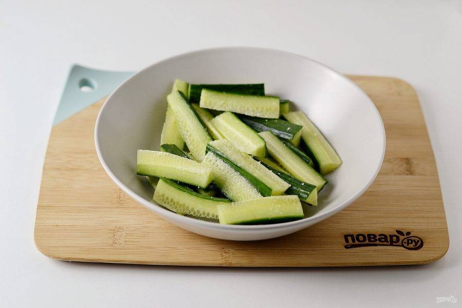 Огурцы нарежьте брусочками. Посолите, оставьте на полчаса. Сок, который дадут огурцы слейте.