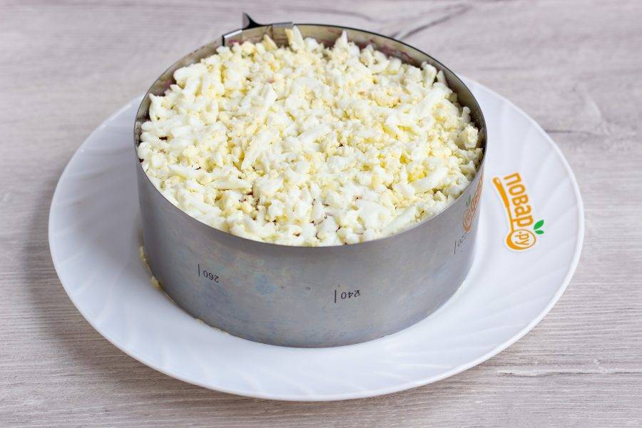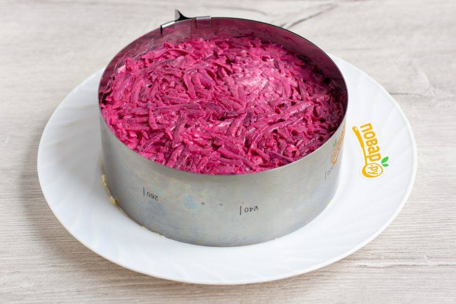 Свеклу очистите, натрите на крупной терке, заправьте майонезом, посолите и выложите третьим слоем.
