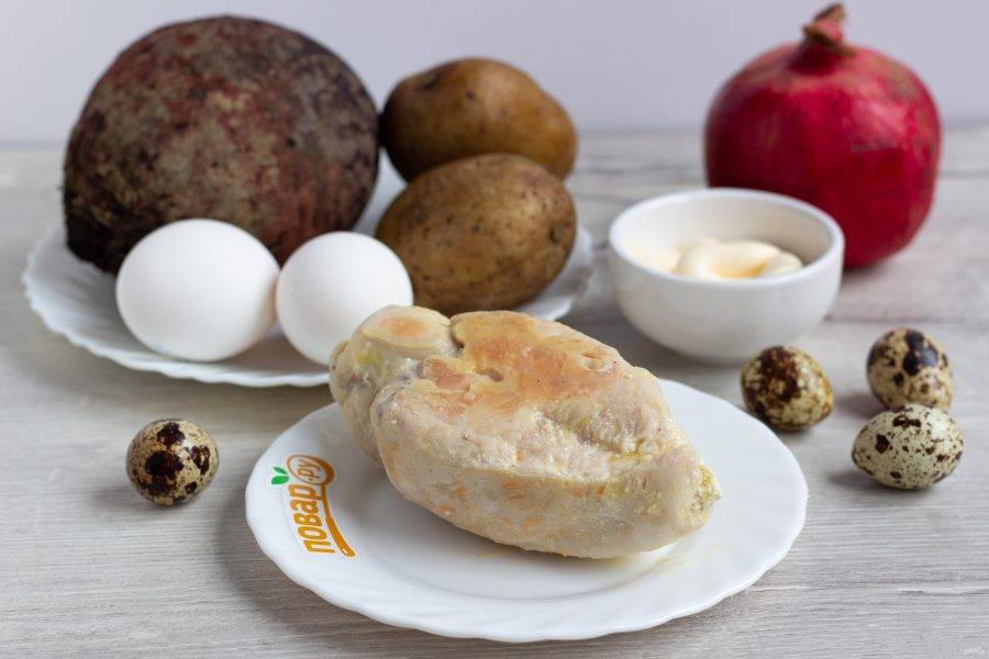 Подготовьте все необходимые ингредиенты. Куриные и перепелиные яйца заранее отварите. Свеклу и картофель отварите в подсоленной воде. Куриную грудку также заранее отварите в подсоленной воде или приготовьте в мультиварке.