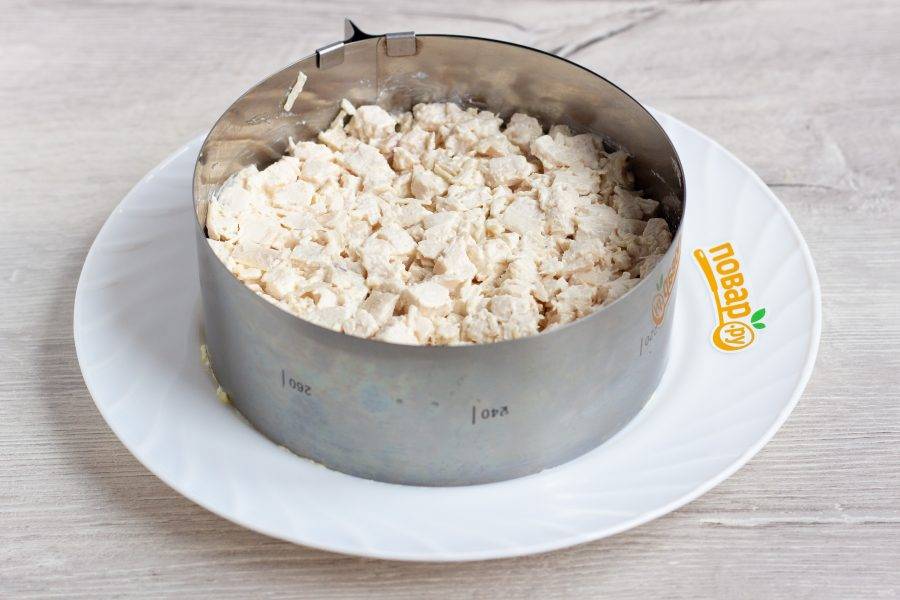 Куриное филе нарежьте кубиками, заправьте майонезом, посолите и выложите вторым слоем.