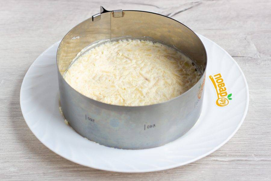 Когда всё подготовлено и остыло, приступим к приготовлению салата. Картофель очистите, натрите на крупной терке и смешайте по вкусу с майонезом, посолите по вкусу. 1 слой: картофель, заправленный майонезом. Кулинарное кольцо диаметром 14-16 см.