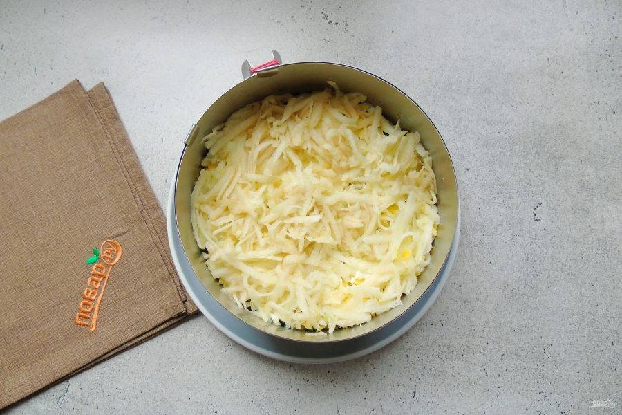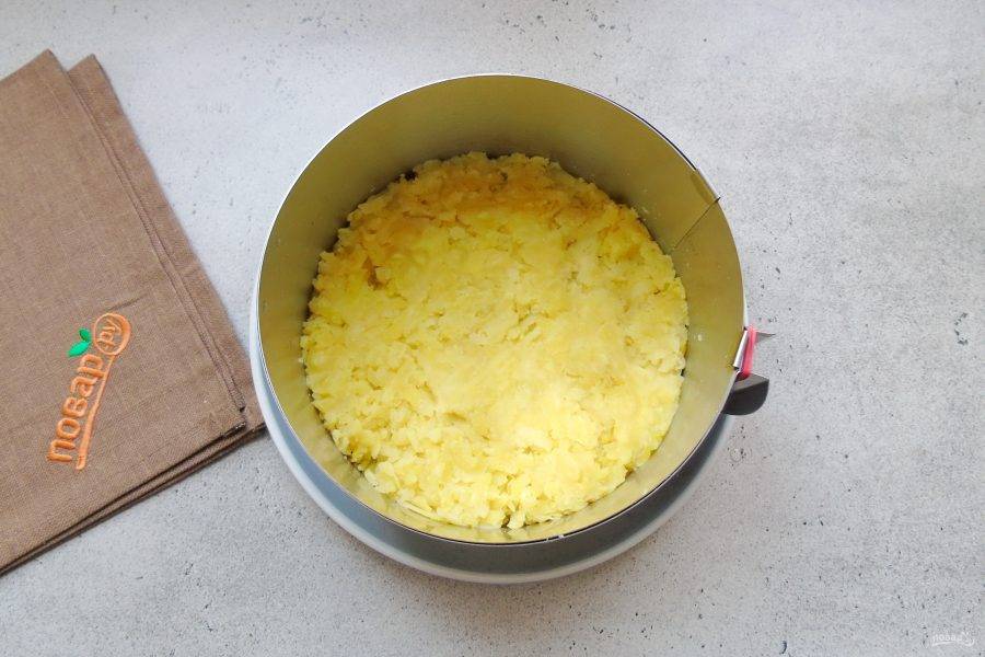Картофель отварите, натрите на терке и выложите первым слоем салата. Смажьте майонезом.