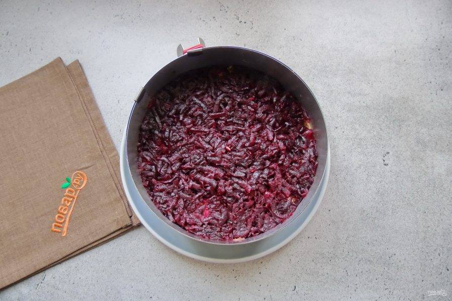 Свеклу отварите, охладите и очистите. Натрите на терке и выложите верхним, последним слоем салата.
