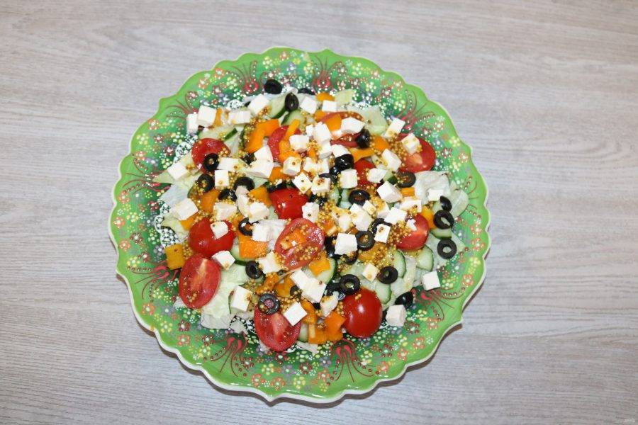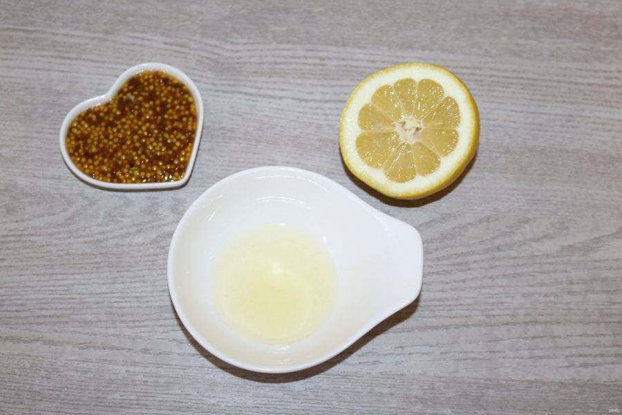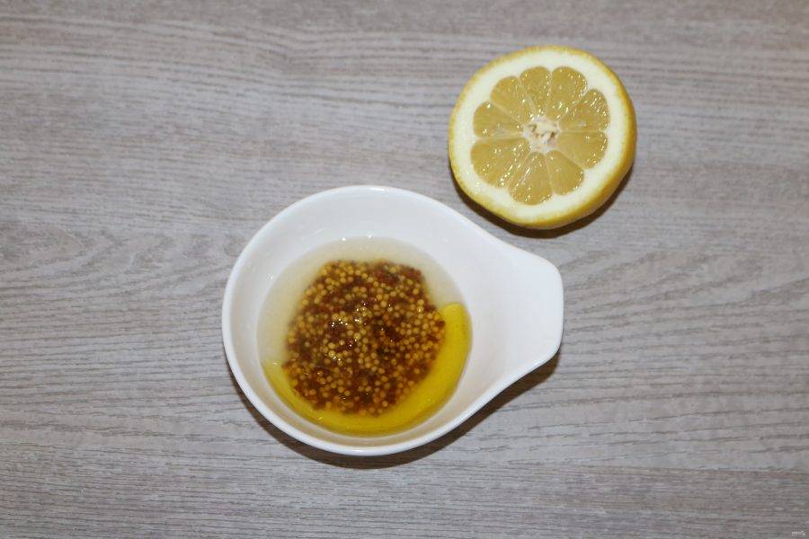 Смешайте оливковое масло, французскую горчицу и лимонный сок. Хорошо перемешайте.