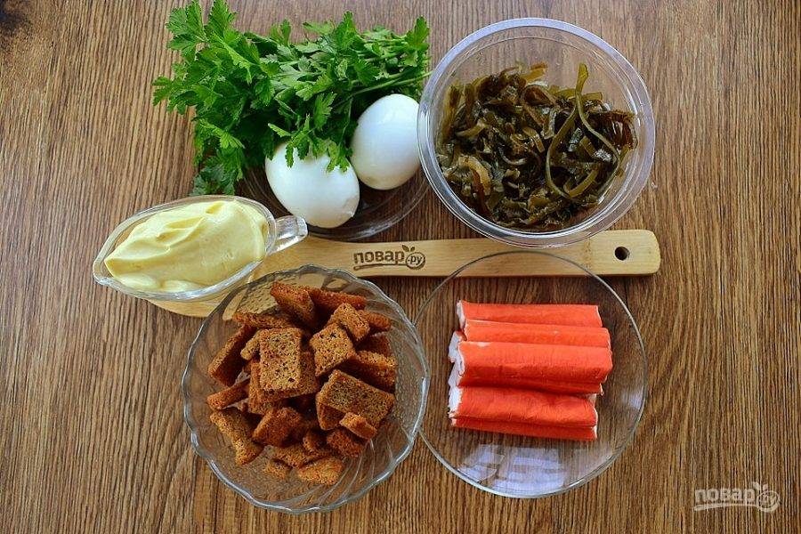Подготовьте необходимые продукты. Крабовые палочки заранее достаньте из морозильника и разморозьте при комнатной температуре. Яйца очистите.