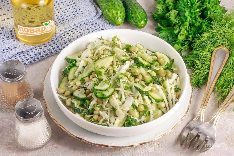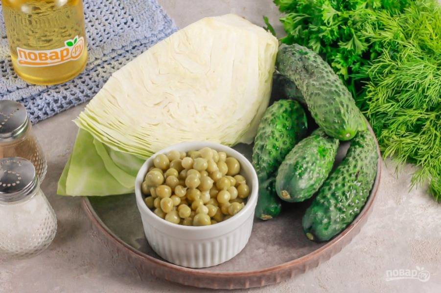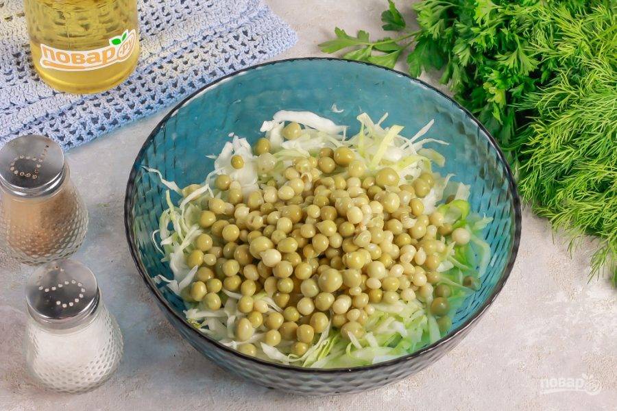 Белокочанную капусту мелко нарежьте лентами и выложите в глубокую емкость. Всыпьте щепотку соли и аккуратно перетрите нарезку, чтобы она выделила сок. Добавьте консервированный горошек, отцеженный от маринада.