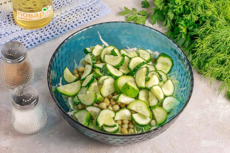 Промойте огурцы в воде, срежьте хвостики с овощей и нарежьте их полукольцами. Добавьте нарезку в емкость к капусте.