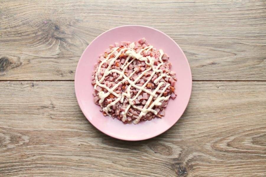 Копченую колбасу нарежьте мелким кубиком и ровно выложите поверх картофельного слоя, закрывая его. Сделайте сеточку из майонеза.