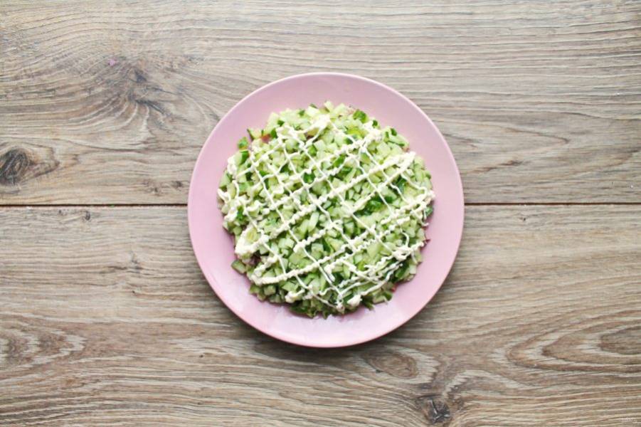 Огурец порежьте мелким кубиком, немного отожмите, если он дает много сока, и разложите на колбасный слой. Нанесите сеточку из майонеза.