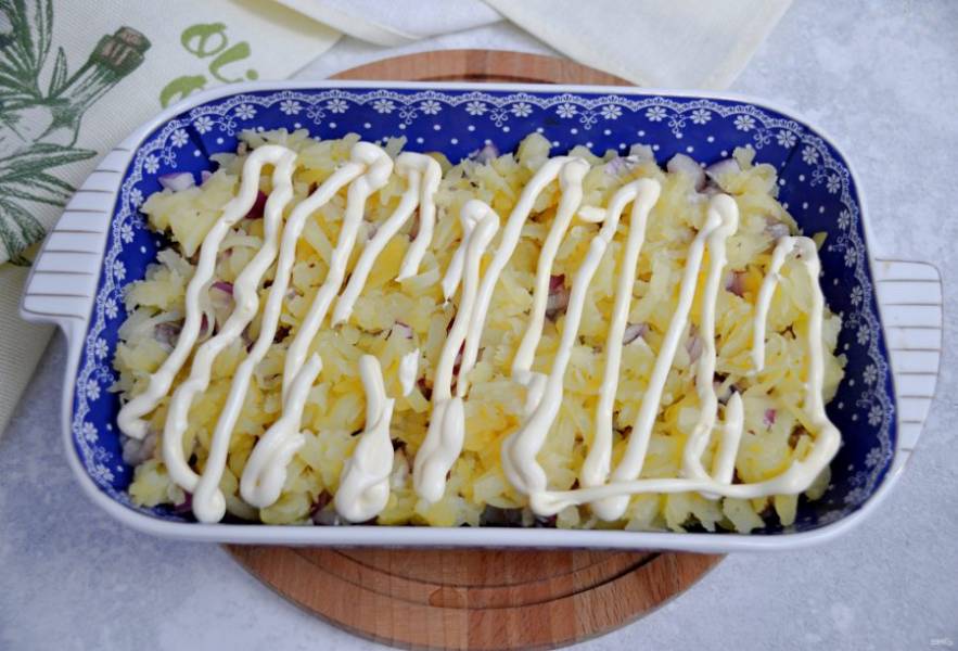 На дно блюда выложите половину картофеля, смажьте майонезом.