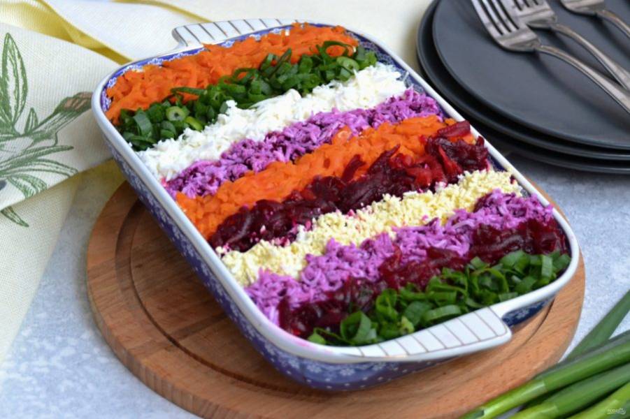 Уверена, никто не догадается, что скрывается за этим салатом. На самом деле, в основе этого яркого красивого радужного салата лежит салат «Сельдь под шубой». Давайте готовить, рецепт очень простой!