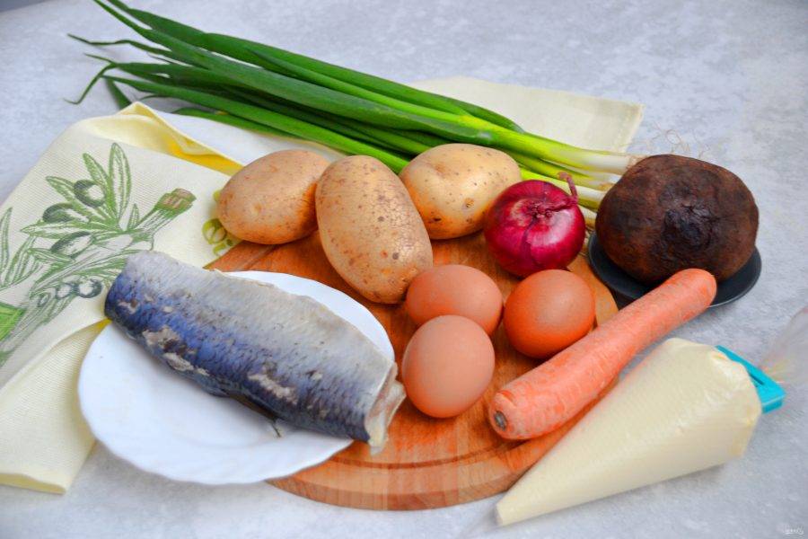Подготовьте ингредиенты для приготовления салата, отварите яйца, картофель, свеклу и морковь. Овощи можно не отваривать, а запечь, так салат будет еще вкуснее.