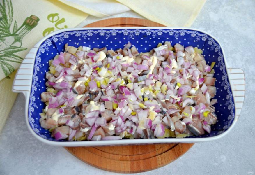 На сельдь выложите мелко нарезанный салатный лук.