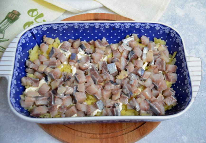 На картофель выложите сельдь, нарезанную мелким кубиком.