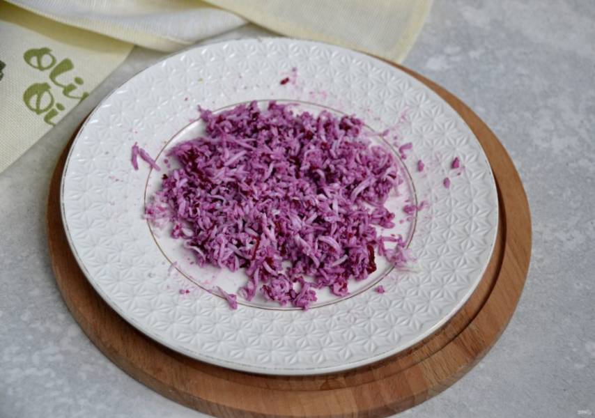 Отложенные белки натрите на терке, оставшейся после свеклы, они окрасятся в красивый яркий цвет.
