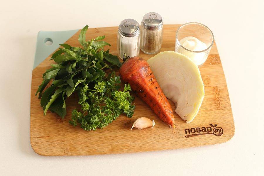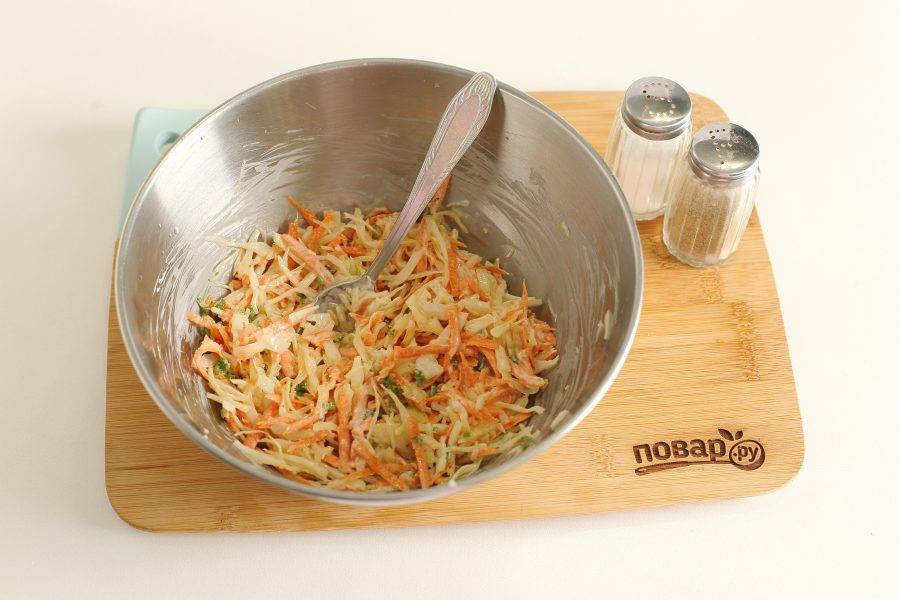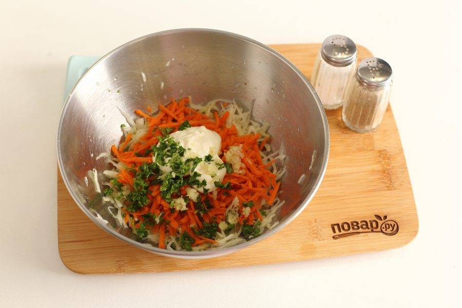 Заправьте салат сметаной или майонезом, добавьте рубленую зелень, измельченный чеснок, соль и молотый перец.