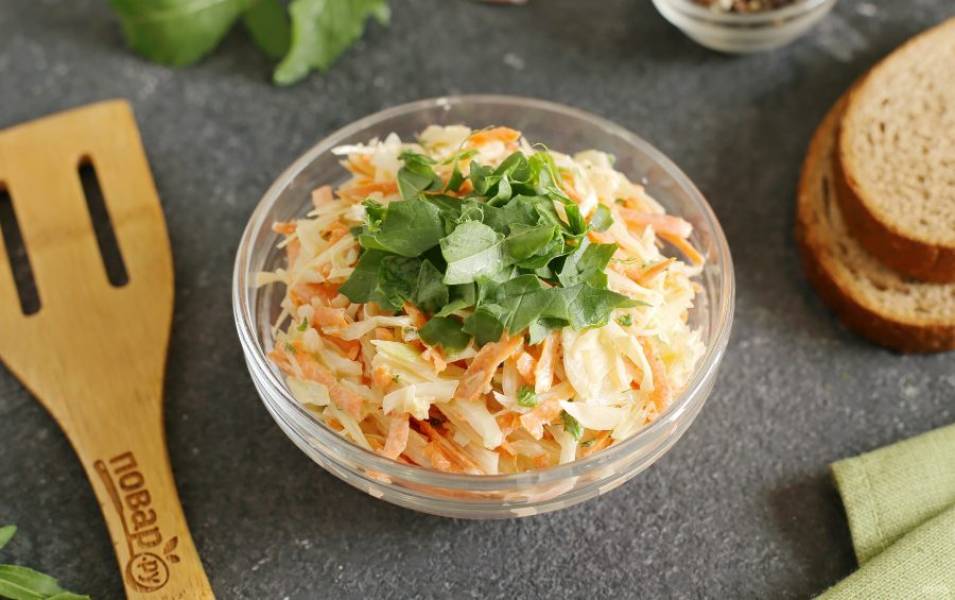 Перед подачей украсьте салат листиками рукколы. Приятного аппетита!