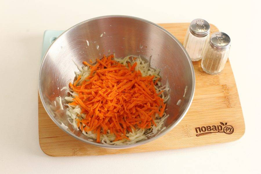 Добавьте щепотку соли и помните руками, чтобы капуста стала мягче.