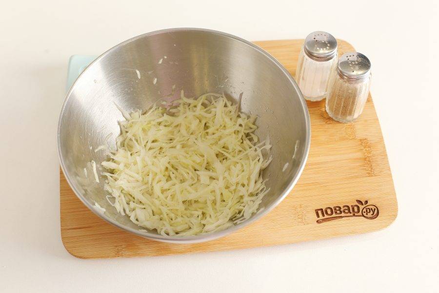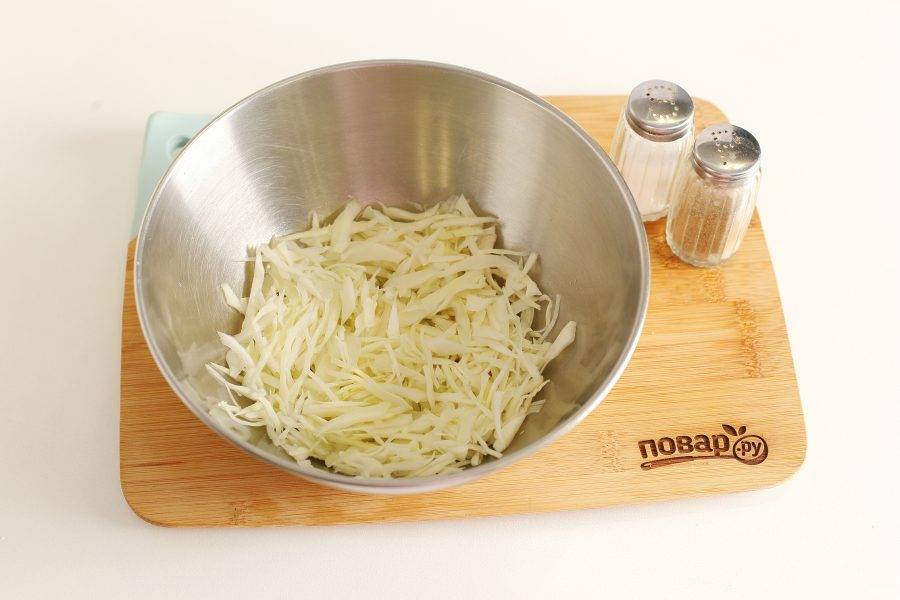 Капусту тонко нашинкуйте и переложите в глубокую миску.