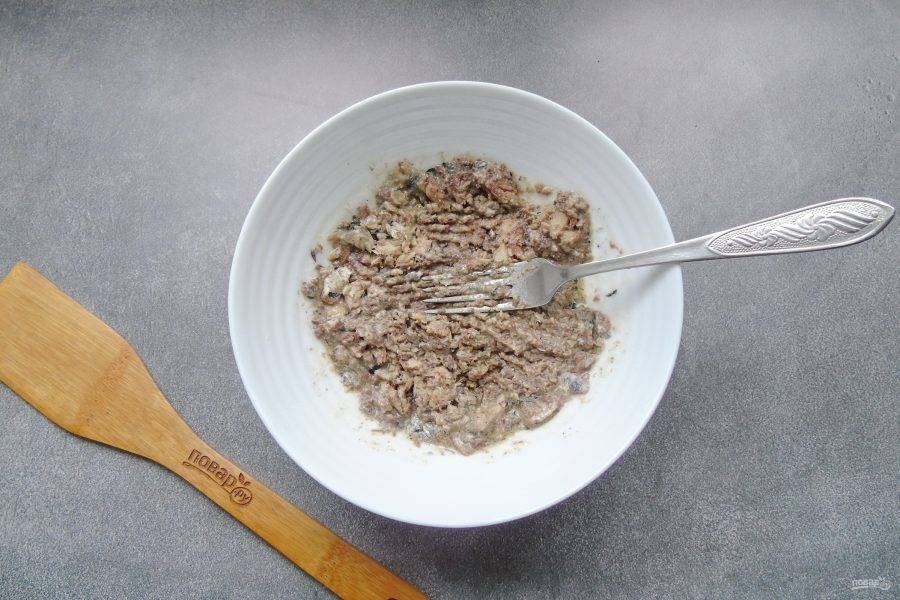 Сардину достаньте из банки, выложите в салатник и разомните вилкой.