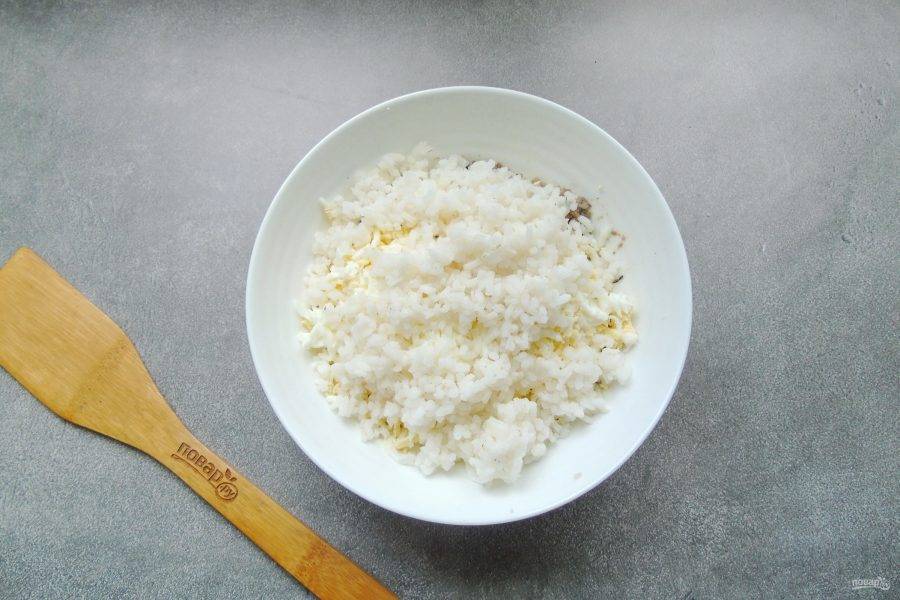 Рис отварите, охладите и выложите в салат.