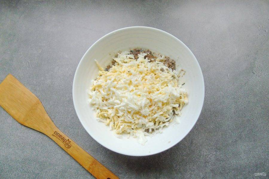 Сварите 4 яйца вкрутую. Охладите и очистите. Желток одного яйца и четверть белка оставьте для украшения салата. Остальные яйца натрите на терке и добавьте в салат.