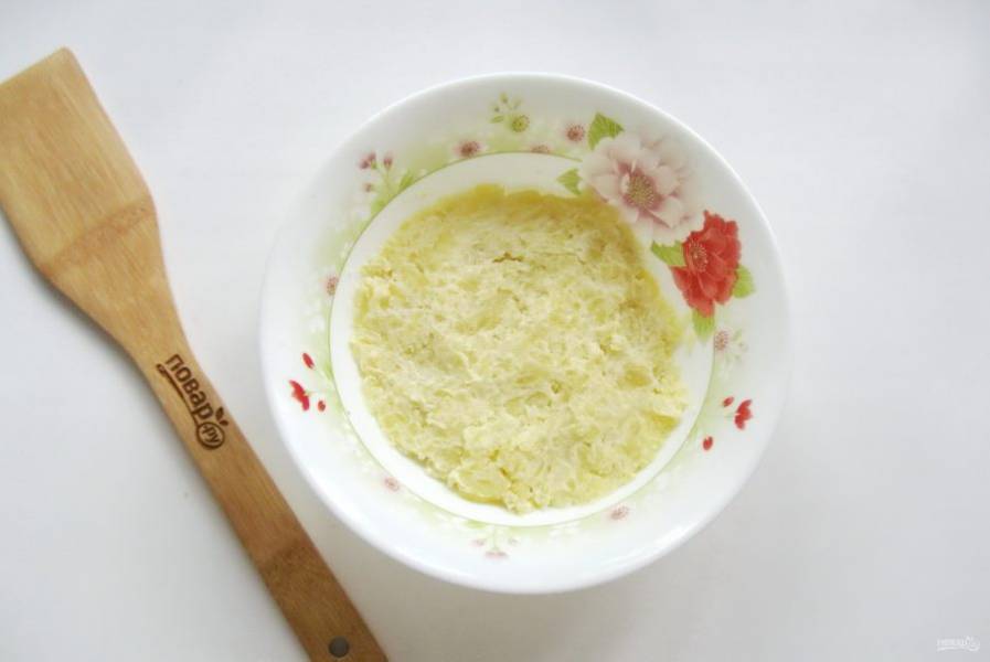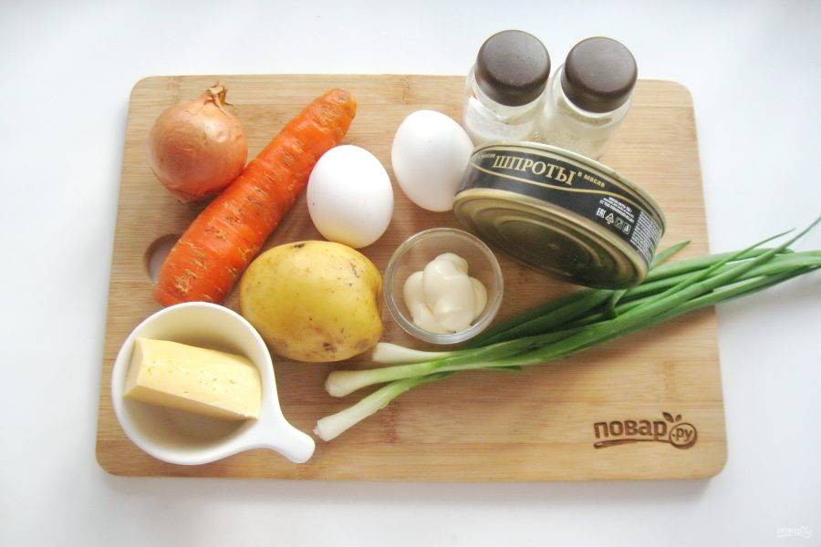 Картофель отварите, охладите и натрите на терке. Смешайте с майонезом и посолите по вкусу. Выложите в салатник первым слоем.