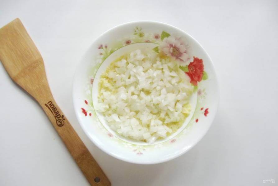 Репчатый лук очистите, помойте и мелко нарежьте. Выложите в миску и залейте кипятком, чтобы ушла горечь. Оставьте лук в кипятке на 10 минут, после воду слейте.