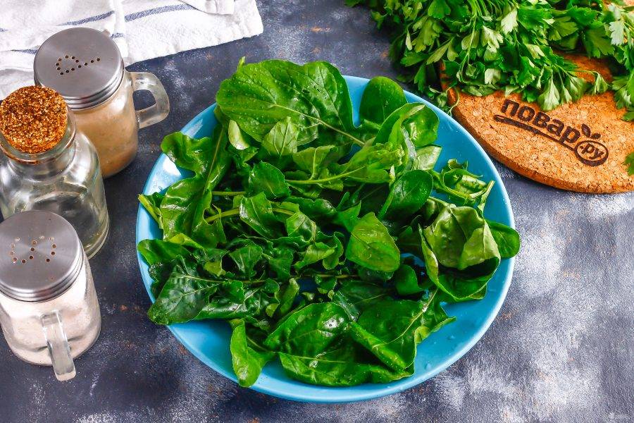 Пучок рукколы промойте в воде, разобрав в руках на листья. Слишком крупные удалите — они горькие. Остальные выложите на тарелку, стряхнув лишнюю влагу.