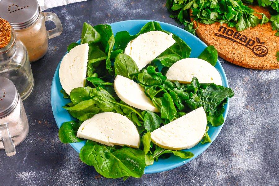 Моцареллу нарежьте ломтиками. Можно использовать как колбасный сыр, так и шарики сыра любого размера. Выложите на рукколу.