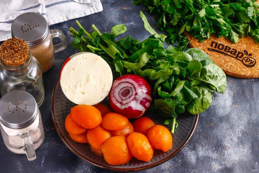 Подготовьте указанные ингредиенты. Абрикосы можно использовать как свежие, так и консервированные. С последними — вкус салата будет более ярким, сочным.