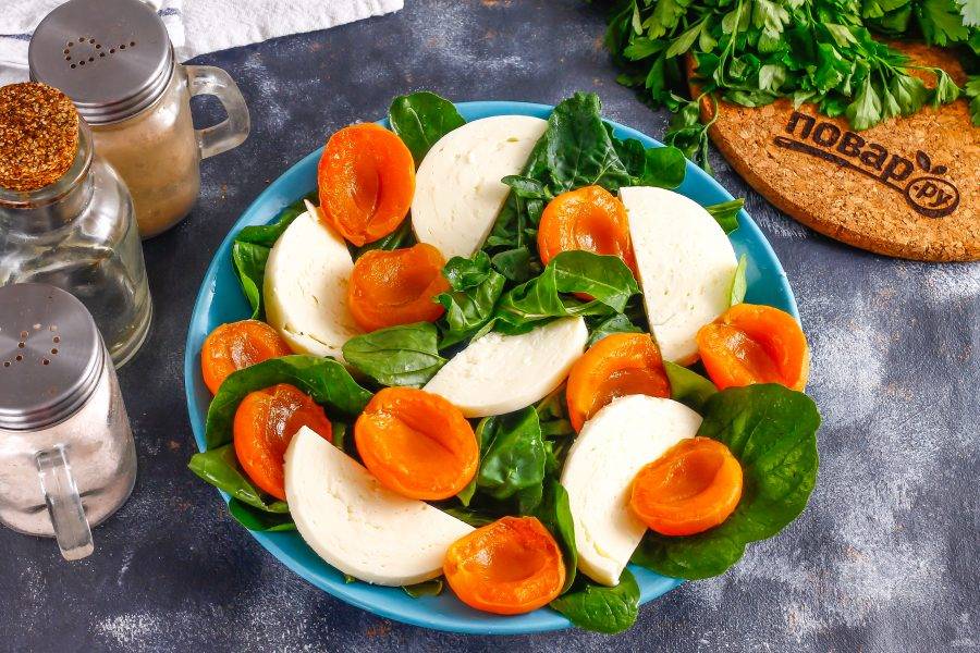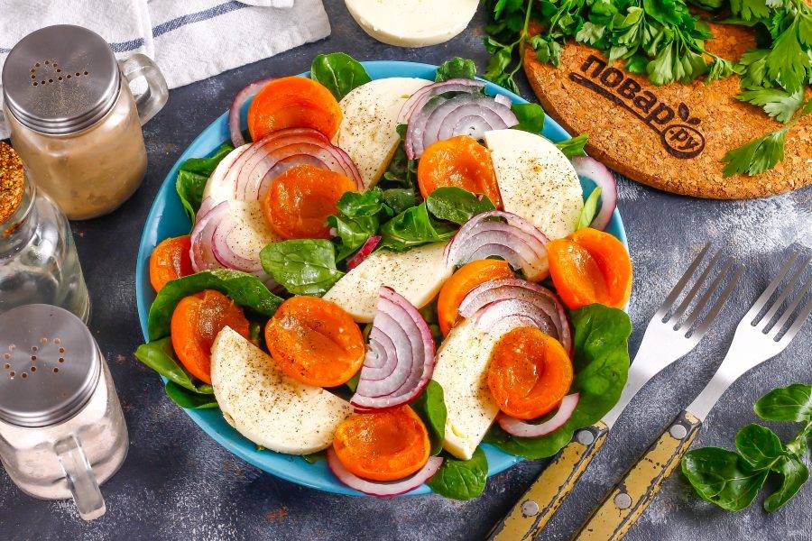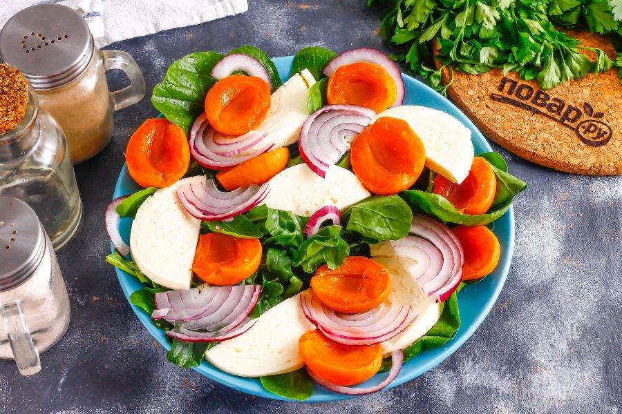 Сочный салат с сыром и абрикосом понравится тем, кто придерживается безуглеводной диеты или не употребляет мясо, птицу. Заправляется блюдо растительным маслом или белым соусом без чесночной нотки.