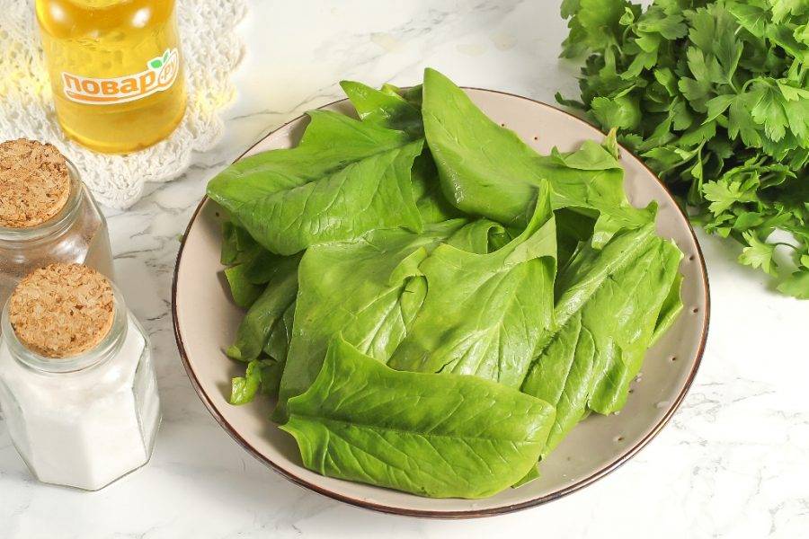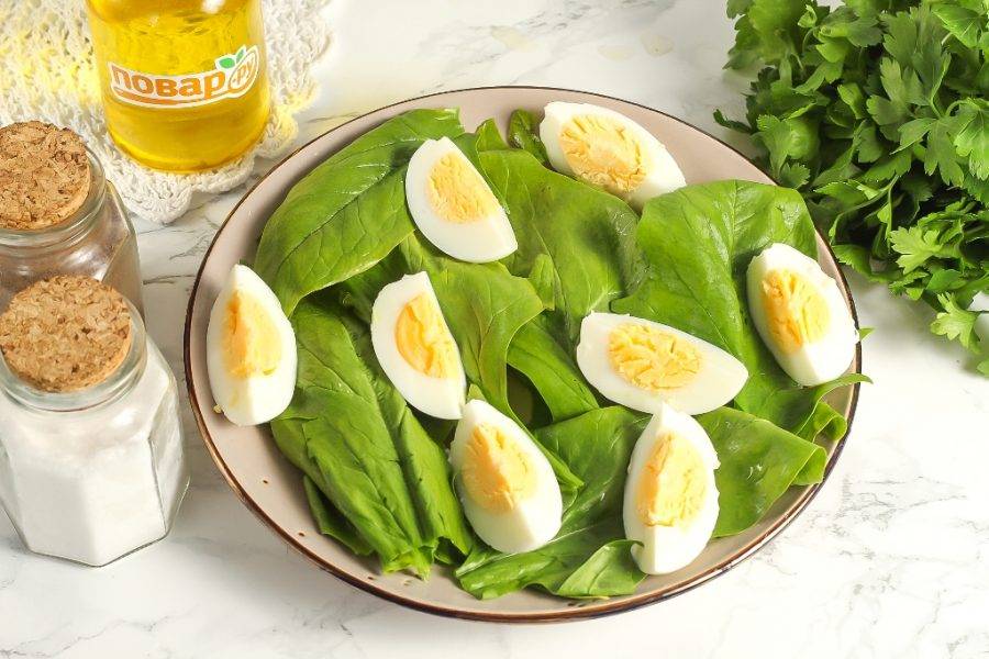 Промойте листья шпината в воде, срежьте стебли и стряхните лишнюю влагу. Выложите на тарелку. Можно заменить их листовым салатом, рукколой.
