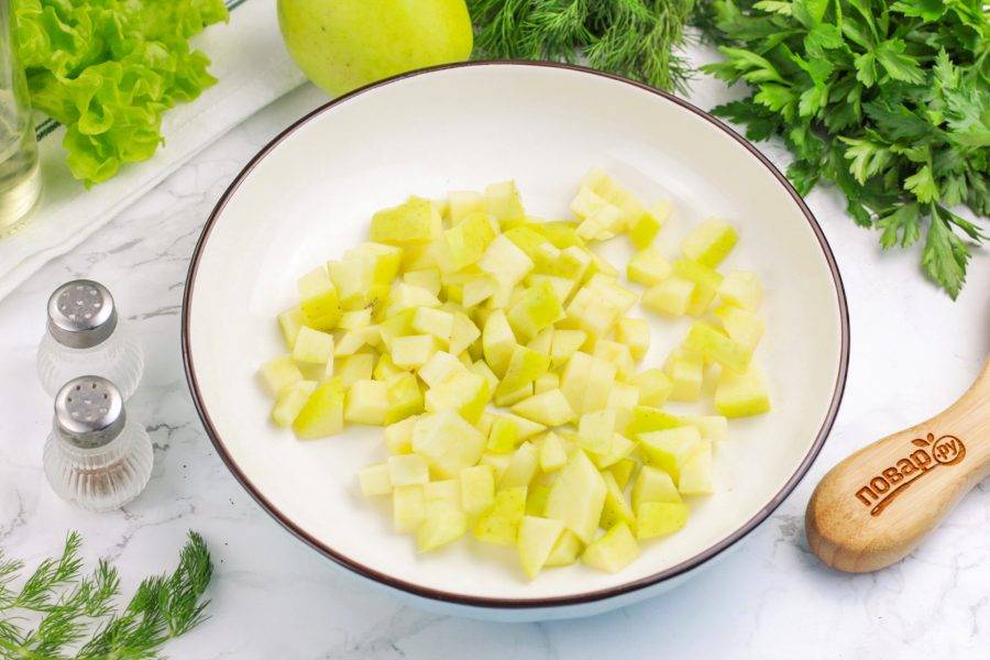 Яблоко промойте в воде и разрежьте на четыре части. Вырежьте семенные блоки и нарежьте мелкими или средними кубиками.