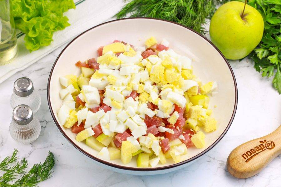Очистите отварные куриные яйца от скорлупы и промойте в воде, нарежьте такими же кубиками и добавьте в емкость.