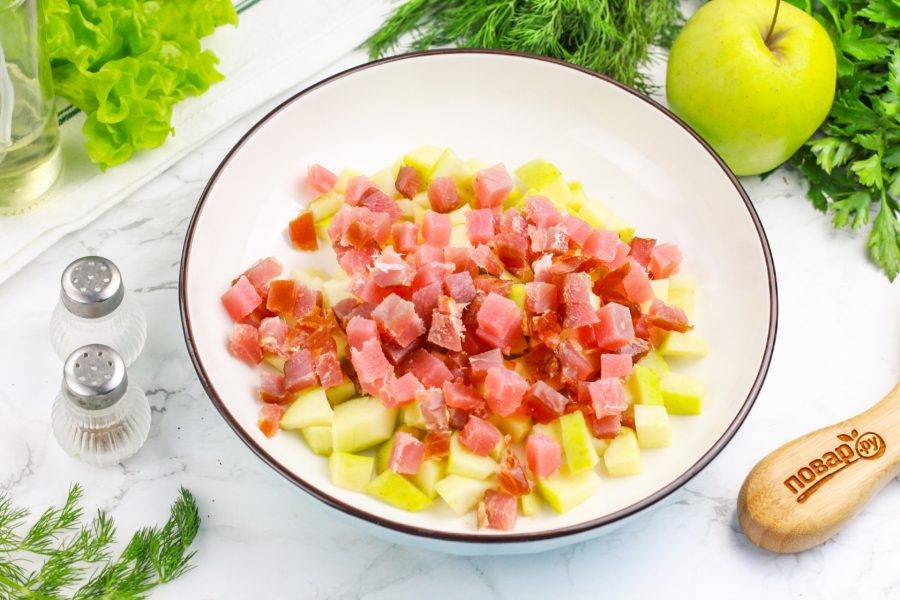 Филе слабосоленого тунца нарежьте такими же мелкими кубиками и добавьте в емкость к яблоку.