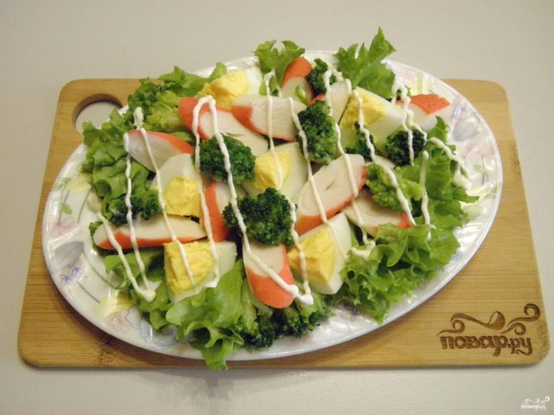 Разложите капусту брокколи. Посыпьте солью и орегано. Сделайте майонезную сеточку. Салат готов, приятного аппетита!