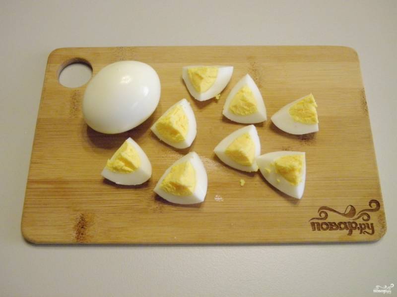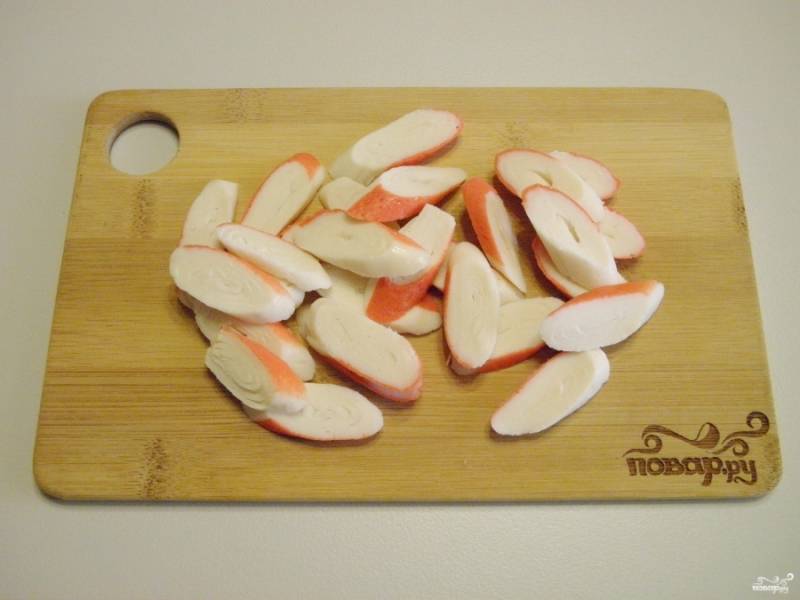 Крабовые палочки порежьте, как вам нравится, я порезала наискосок, так они смотрятся симпатичнее.
