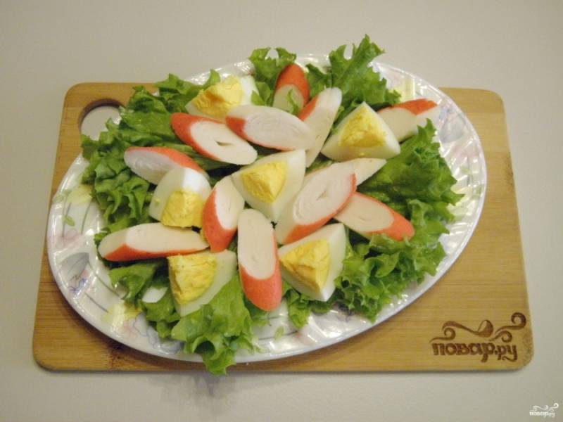 Подготовьте продукты для салата. Листья тщательно вымойте, отварите яйца. С крабовых палочек снимите упаковочные обертки.