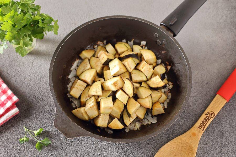 Обжарьте все помешивая до полной готовности баклажанов. За пару минут добавьте измельченный чеснок и разрезанные пополам помидоры черри.
