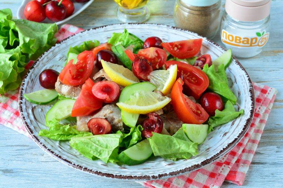 У черешни удалите косточки, выложите ягоды в салат. Сбрызните блюдо лимонным соком и полейте оливковым маслом. Добавьте по вкусу специи.