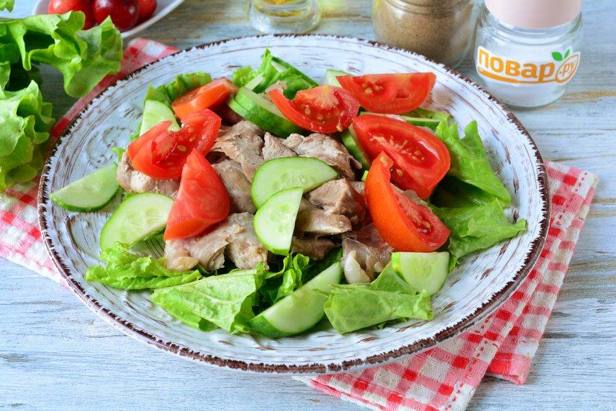 Порвите листья салата и выложите на тарелку — это будет подушка для блюда. Выложите мясо индейки.