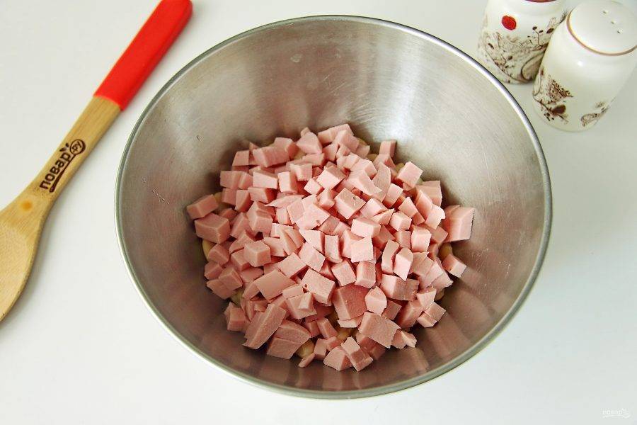 Добавьте нарезанную кубиками колбасу. Колбасу можно взять как вареную, так и копченую по желанию.